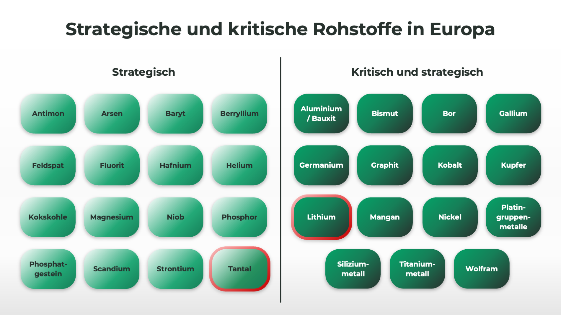 Ein prägnantes Beispiel für einen kritischen Rohstoff ist Tantal. Tantal kommt überwiegend in Form des Erzes Coltan vor. Aufgrund seiner hohen Hitzebeständigkeit wird Tantal vor allem in der Elektronikindustrie eingesetzt, etwa für Kondensatoren in Smartphones, Computern und anderen digitalen Geräten.