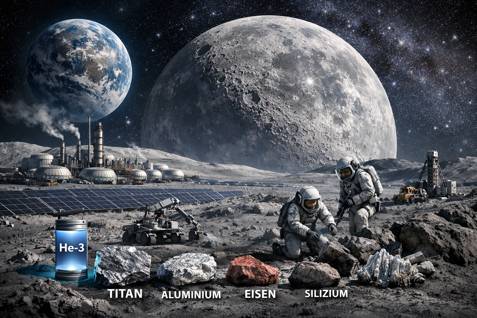 Der Mond gilt heute als realistischster Ort, an dem Rohstoffe gefördert werden könnte. Sein Regolith – eine lockere, sandähnliche Gesteinsschicht auf der Mondoberfläche – enthält unter anderem Helium-3, Titan, Eisen, Aluminium und Silizium. Besondere Aufmerksamkeit gilt dabei Helium-3, das als potenzieller Brennstoff für zukünftige Kernfusionsreaktoren diskutiert wird und langfristig eine nahezu emissionsfreie Energiegewinnung ermöglichen könnte. Die übrigen Materialien besitzen ebenso große strategische Bedeutung.